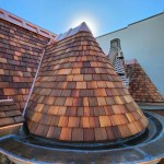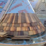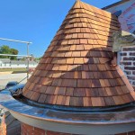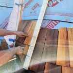 Shingle work. We special-ordered extra-long and thick cedar shingles and hand-dipped each one in a tub of Woodlife, a borate-based wood preservative, before installing it. For the turret shingles, we cut each side at a shallow angle so they could be installed tight at the butt end without overlapping at the top end. A story pole, with a metal hook that we fashioned at the top to allow us to rotate the pole around the curved fronts, helped us keep the coursing straight.