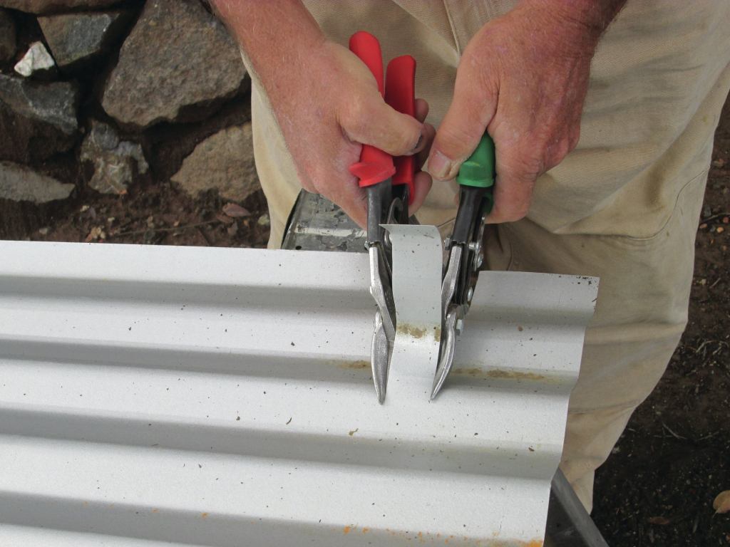 In the absence of any of these electric tools, I’ve had good luck cutting metal roofing using two off-set aviation snips (see photo). Aviation snips have compound cutting action to give them greater leverage for cutting through thicker metal, and the off-set blades mean I can keep my hands safely above the metal. These snips come in two colors: green and red. With the green snips, the waste comes off the right side of the blade, and with the red, the waste comes off the left side. I hold green ones in my left hand and red ones in my right hand. Then with the blades positioned about an inch apart, I make my cut with both snips at once and the waste curls up between them, creating the same effect as sheet-metal shears. This works for cutting across a sheet as well as at an angle.