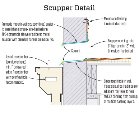 I feel the same way about scuppers as I do about roof drains: They’re tricky to detail, and the smaller they are, the more prone they are to clogging with leaves and debris. I have seen 4-inch-tall openings clog; we now recommend 8 inches for scupper opening height and at least 12 inches for width (the wider, the better).