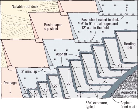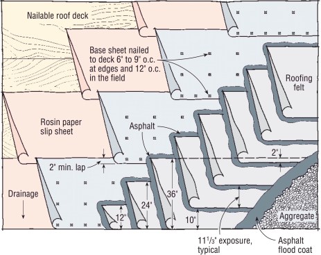 • Flashings are bedded in plastic roof cement over the base sheet, nailed in place, and primed to make the hot asphalt stick better. • The roofing felt and asphalt are laid over the flashings.• The flashing is then sealed with roofing cement and coated with an aluminum paint to protect it from UV light.