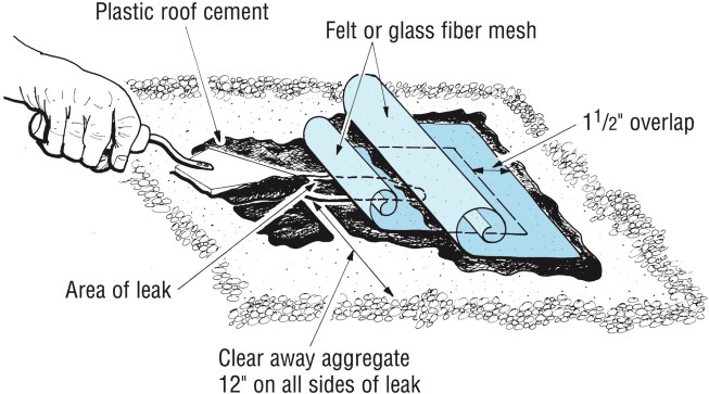 - Apply the patch with a thin coat of plastic roofing cement. Apply plastic roofing cement carefully: too much will weaken the bond between the existing BUR and the new patch.