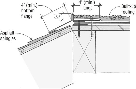 A flat built-up roof that meets a sloped roof must have a gravel stop to prevent the asphalt flood coat and gravel from migrating down the sloped roof.