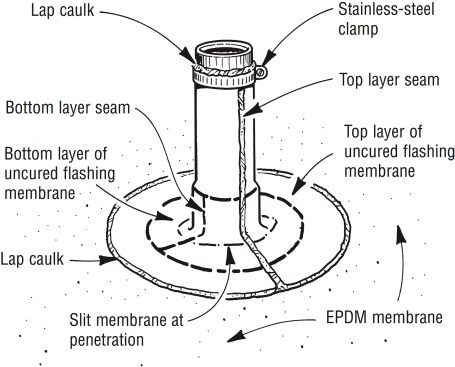 Narrow rolls of uncured EPDM are available for patching and flashing applications. Uncured EPDM has no memory, so when you stretch and glue it around a vent pipe it forms itself to the shape of the pipe.