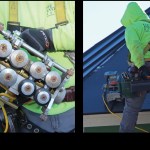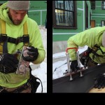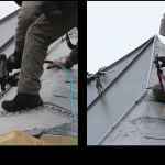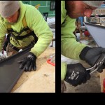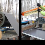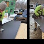 With the EPDM in place, we were ready to attach metal roofing. The crew cut the long tapered sections on the ground using metal snips, and bent the legs on the cuts using the Wuko bender and a pair of 45-degree hand tongs. Then we went about assembling the panels together onto the roof.