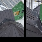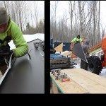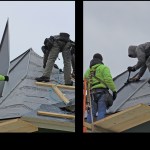 Standing seam roofing panels are installed on a turret roof in Northern Vermont by Dusty Morrits (left) and Dalton Haskins (right) of Evergreen Roofing based in Colchester, VT.