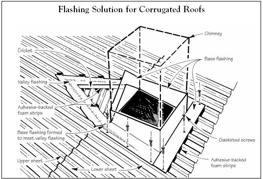 - Q. I have to flash a chimney where it penetrates a corrugated metal roof with ridges 8 inches o.c. What’s the solution?