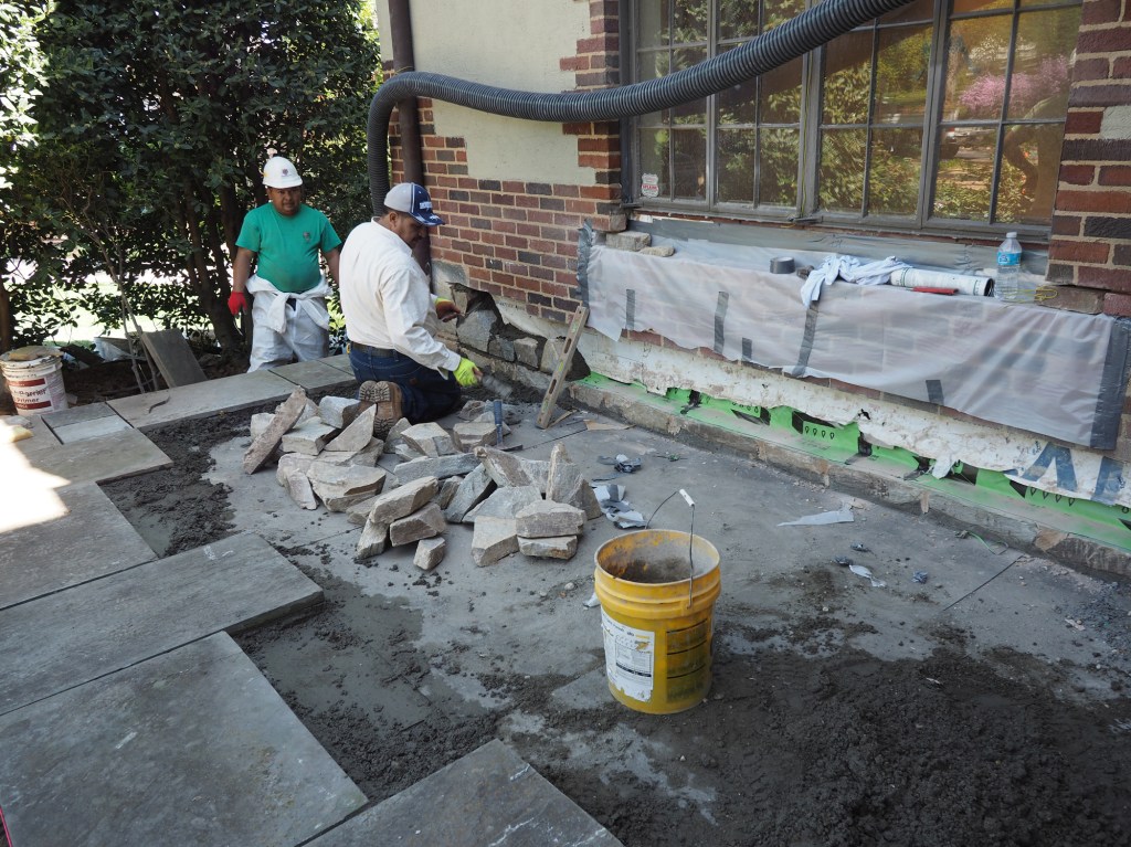 So our replacement of the flagstone patio, again, had to include a reworking of that intersection. In photo 14 above, the crew has taped back the housewrap, primed the plywood wall, and applied rubberized asphalt to the slab and up the wall. Next, they laid down sheets of fibrous protection board, which allowed the masons to rebuild the wall masonry without getting themselves covered in the soft, sticky asphalt, and then to pave the patio without damaging the waterproofing.
