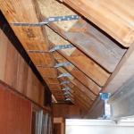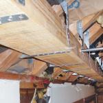 We also used hurricane straps to secure the ceiling joists above the second-floor bedrooms to the rafters along the front wall of the house. Where necessary we added AdvanTech spacers to bring the rafter bottoms into better alignment with the floor joists. This completed the engineer’s design, effectively tying opposing rafters to one another through the tie rods and the second-floor diaphragm.