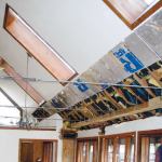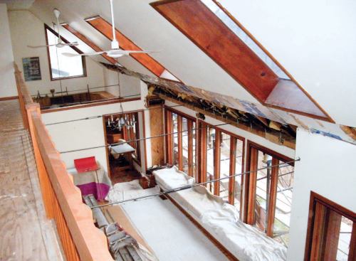 Installing the beam required a bit of disassembly in and around the bump-out. We had to remove the windows along the sides of the bay to keep them from cracking when the wall was pulled in, and we had to remove some of the drywall ceiling so that we could attach the glulam beam to the rafters above the bump-out. Rather than replacing and finishing new drywall, however, we decided to enclose the beam in a soffit. That enclosure and the six steel rods, which would also be enclosed, were the only apparent changes to the home’s architecture at the end of the job.
