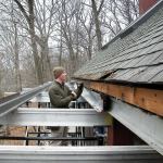 After removing the vented aluminum soffit covering, we lifted the roof just enough to get a Sawzall blade between the rafters and the wall plate – about 1„4 to 1„2 inch – then cut the nails that held them together. We were now ready to install the horizontal beam.