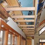 The horizontal beam was a 3 1„2-inch-by-7 1„4-inch stock glulam. (A Parallam would also have been appropriate for this purpose, but would have necessitated a larger beam.) We supported the glulam on its side and secured it horizontally and vertically to every rafter with Simpson twist straps.