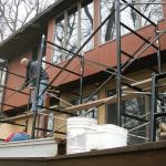 To start with, the weight of the roof would have to be lifted off of the exterior wall before we could pull the wall back into plumb. Again, we considered a number of options – including a temporary exterior wall – but Dick came up with a better idea: Lift and support the wall with a temporary aluminum I-beam supported by heavy-duty steel scaffolding.