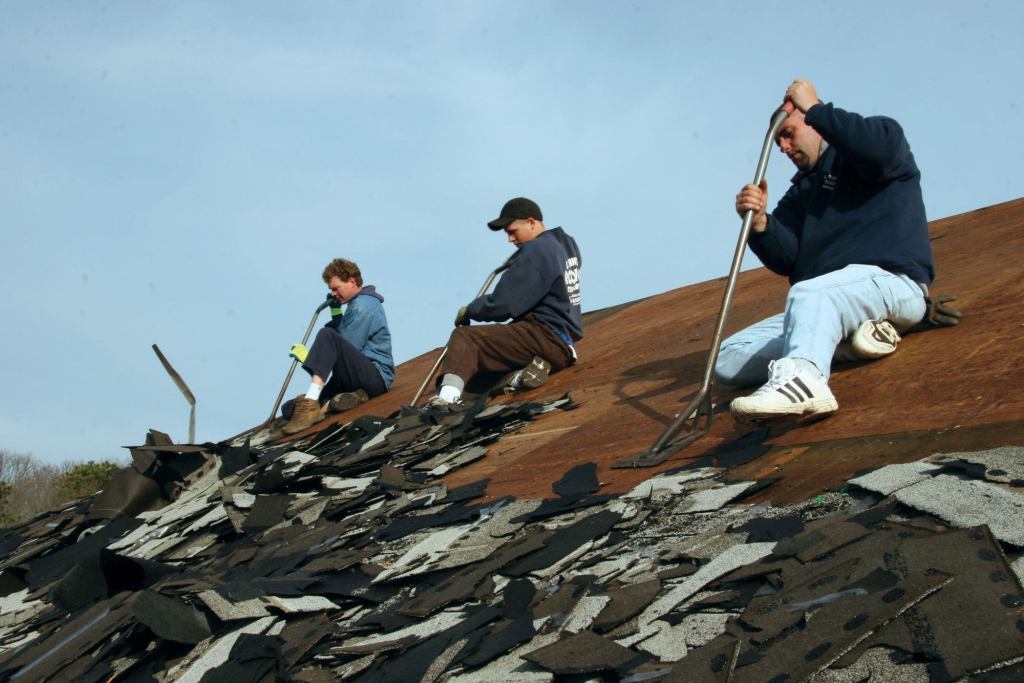 Tear off asphalt shingles from a seated position (see photo). Start at the peak and work down toward the eaves using a shovel-like, serrated stripping tool such as the Shingle Eater to get under shingles and pry out fasteners. Workers should wear safety harnesses secured to a stable anchor point. Three workers can typically tear off about 4 squares of roofing per hour.