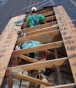 If the roof-wall connection isn’t accessible from inside the attic and the inspection indicates that you have to add hardware, you will need more than just a peephole. One way to gain access is to take up roof decking at the eaves, as shown in Figure 2. But that leaves the house exposed to any rain that comes along while you are working or waiting for the inspector to show up. And according to code, you cannot reuse the decking you pulled off; you need fresh decking.
