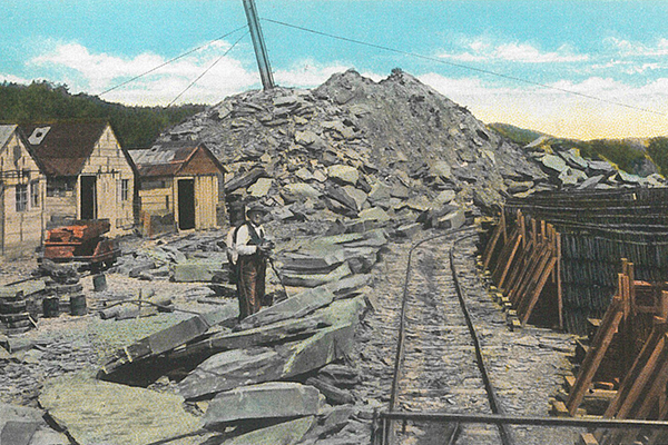 A slate quarry in Granville, NY. circa 1920. Shanties line the left side of the yard while stacked slate piles line the right. The completion of the Rutland and Washington Railroad line through Castleton, Poultney, and Granville in 1852 vastly expanded the market for slate beyond the local area to other parts of the northeast and the Midwest. By the turn of the century, up to 250,000 squares of roofing slate were being shipped annually from the slate valley; peaking at 425,000 squares in 1908. Image courtesy of the Slate Valley Museum