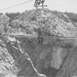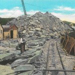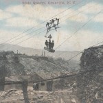 A slate quarry in Granville, NY. circa 1920. As quarry pits got wider and deeper, carriages run on steel cables held aloft by “quarry sticks” were needed to hoist the stone out of the maturing quarries. According to The Slate Roof Bible by Joseph Jenkins, “By 1872, over 11,000 tons of roofing slate were being shipped annually from Poultney, Vermont, amounting to about 35,000 squares of roofing— enough to cover roughly 3,000 average houses.” Image courtesy of the Slate Valley Museum