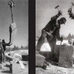 A carriage hoists up a slate block from the bottom of the Eureka Quarry in North Poultney, VT circa 1948 (left). Eureka Quarry workers split blocks with hammers and chisels (right). See video, “Heavy Lifting: A Human & Technological History of Moving Slate from Quarry to Market”, for information about the unique history of the roof slate industry along the Vermont-New York border. Images courtesy of the Slate Valley Museum