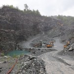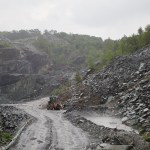 Large pieces of slate or “blocks” are transported from the pit to a nearby processing mill via a big-haul truck or smaller dump trucks. Water, seen here on the right, needs to be pumped out of the pit every day.
