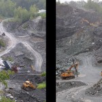 The access road, looking north (left). A drilling rig or “John Henry” is used to core holes in the slate deposit for blasting (right, lower left of photo). Slate deposits in the region lay at roughly 45-degree angle in the ground. Quarriers in the past predominantly worked the highest quality slate deposits—the resulting slate back then could be split as thin as 3/16 of an inch as opposed to today’s minimum thickness of ¼ to 3/8-inch. Modern tools and transportation allow today’s slate companies to manufacture slate products from lesser quality deposits (deposits that quarriers of yesteryear would not touch because they didn’t have the technology to do so). The slate from this quarry has a 75- to 100-year product lifespan, which passes the S1 standard (ASTM C406).