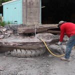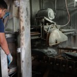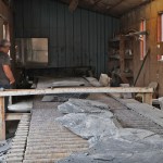 A worker uses an air hammer to split a slate block down to 6-inch-or-less thicknesses in order to fit under the cutting saw arbor. Upon excavation, slate has to be managed carefully. It has a certain amount of moisture content and its cleaving planes can be ruined if the stone freezes or it lays out in the sun too long and dries out; wind is also a factor in freezing and drying. Each fall, slate blocks are stacked in the storage building beyond to maintain production in winter.