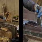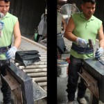 An unchanged technique from the past; a worker hand splits slate with a hammer and chisel (left). Here, he starts splitting a cut piece of unfading gray slate starting at an inner third point (right). He’ll then split the cleaved-off third piece into the desired roof slate thicknesses.