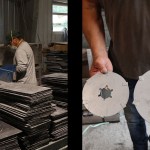 The trimmer cuts the slate down to its finished size (left), putting a chamfered edge on all four sides of the slate; the chamfered edge creates a shadow line when roof slate is installed. The trimmer blade comes in two sizes (right), the smaller blade is used to trim thinner slate, the larger for thicker material. The blade consists of carbide bits soldered onto a steel blade.