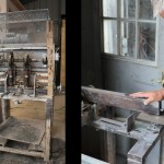Fastener holes in the slate are made with a hole puncher. The motorized hole puncher (not in use) has a cam which oscillates the punching bits (left), while an old-style punch uses a spring-loaded arm to make a striking motion (right). The slate is punched from the back, which creates a blow-out hole in the front that the nail head countersinks into.