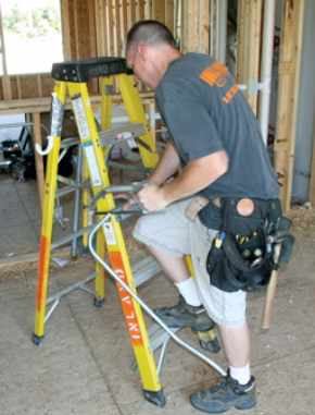 Once the boxes have been secured, the electrician drills holes in the framing members for the conduit. Until recently, he did this by measuring up from the floor and making a series of marks on the studs between the boxes; then he’d drill a 7/8-inch hole through the center of the studs, which put the hole about 1 1/4 inches from the stud faces. Now he uses a laser hole locator from Stabila (800/869-7460, www.stabila.com).