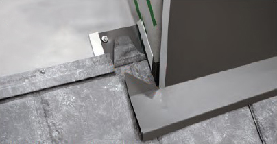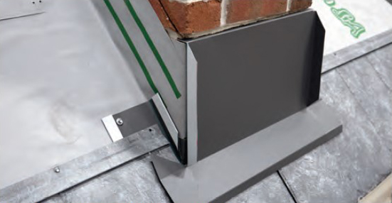 - Finally, using #10 x 1-inch hex head screws, install the anchor cleat on the backflash, aligning with the top lock on the last course of roof panels. This will be the lock for the next course of panels installed above the chimney. Apply sealant where the anchor cleat meets the top lock.