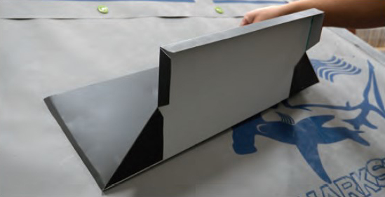 - Bend a minimum ¾-inch return at the top of the sidewall leg to fit into the kerf, and position the sidewall against the side of the chimney, making fold lines at the top and bottom corners. Cut the sidewall to allow for 1-inch tabs to wrap around the apron tab and the top corner of the chimney. Then remove the water stop on the portion of the sidewall that overlaps the panel. Fold a ⅝-inch angled downturn at the cut edges of the sidewall water pan with a hand bender.