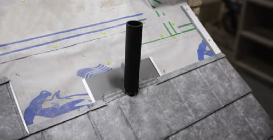 - Field-form a backflash to extend from at least 3 inches beyond the top lock of the last course of panels, down to the chimney, up the back of the chimney, and into the kerf. Cut the backflash 4 inches wider than the corner of the chimney, and form a diverter to guide water around the chimney.