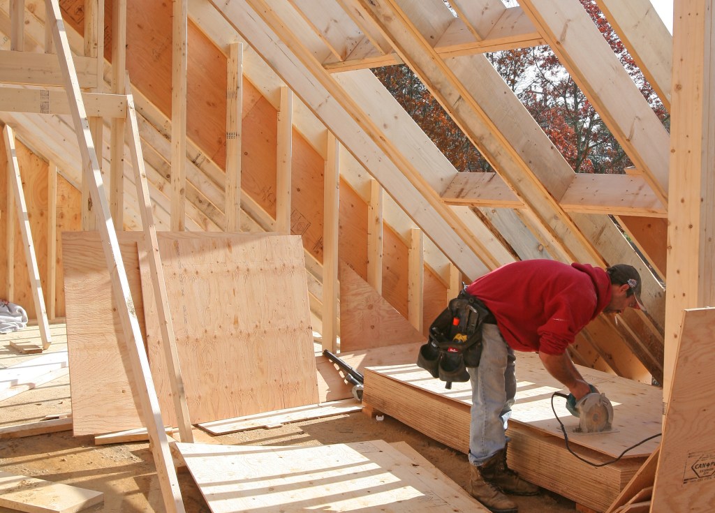 Laminated veneer lumber (LVL), like the structural beam being installed here, is stronger than comparably sized sawn lumber because any natural defects like knots and splits are only one ply deep.