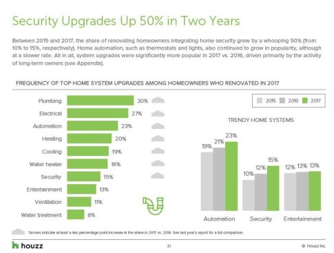 “All of the evidence from our research points to 2018 likely being another robust year for the home improvement industry,” said Nino Sitchinava, Houzz principal economist. “Recent buyers and long-term homeowners alike are keen on investing in major projects. Kitchens and bathrooms continue to fuel spend, while exterior features and systems, such as home security and automation, are on the rise. “