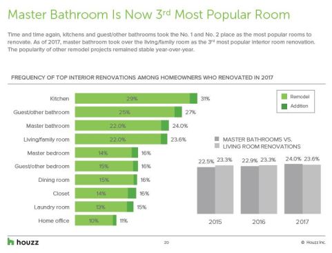 Bathrooms took two of the three top spots for remodeling spending, while kitchens remained No. 1. Nearly a third (31%) of renovating home owners remodeling kitchens, followed by guest bathrooms (27%) and master bathrooms (24%). Master bathrooms overtook family rooms for the third spot. The median spend on kitchen remodels rose 10% year over year, from $10,000 to $11,000.