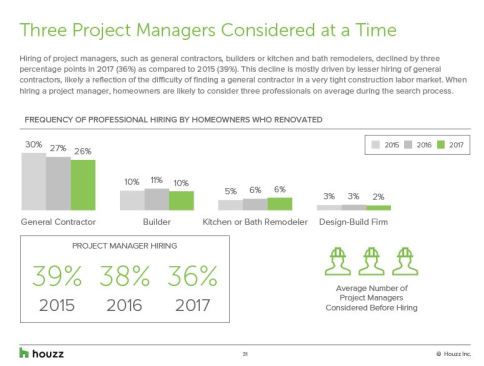 Homeowners say they consider three general contractors before starting a project, but just two design specialists. Roughly 88% of homeowners hire a remodeling professional for renovation needs.