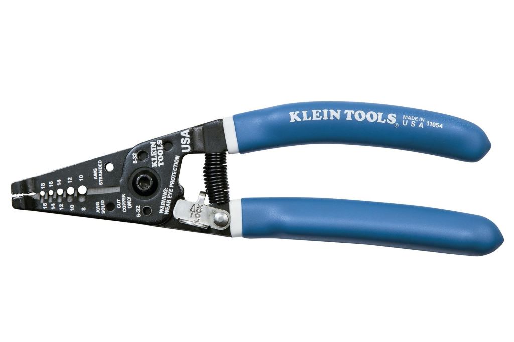 Klein, a company known for its electrician tools, just released a new full-featured pair of strippers that are made in the U.S. The model 11054 cutters can handle 8-16 AWG solid wire and 10-18 AWG stranded wire. The nose of the tool has markings on both sides for quick reference, and the curved handles are easy to use in tight spaces. There are holes for cutting screws as well as for looping and bending wire. The tool is spring-loaded in the open position, but has a closure lock for storage. ¦ Price: $18. 847-821-5500. kleintools.com.
