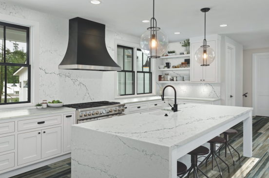 Dal-Tile’s American Reserve and National Marble collections are extra-large, 136-inch-by-79-inch quartz slabs, offering designers more options for seamless countertops, islands, and walls. Shown is an example of quartz slabs from the National Marble line, which offers four different white marble looks dubbed freedom calacatta, liberty calacatta, Rushmore, and Washington. Available in 2- and 3-centimeter thicknesses, these American-made quartz slabs are waterproof, scratch resistant, stain resistant, and heat resistant. daltile.com