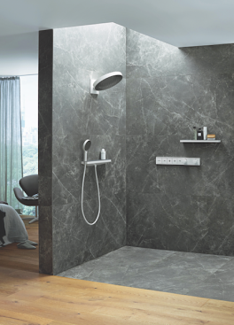The Hansgrohe Rainfinity shower system features an adjustable, concave-shaped three-jet overhead shower that boasts a diffused arrangement of jet disc holes on its eye-catching graphite face so that spray isn’t limited to the head and shoulders. The setup also includes a shelf with hand-shower holder and wall connection, and a unique four-function RainSelect shower trim. hansgrohe.com