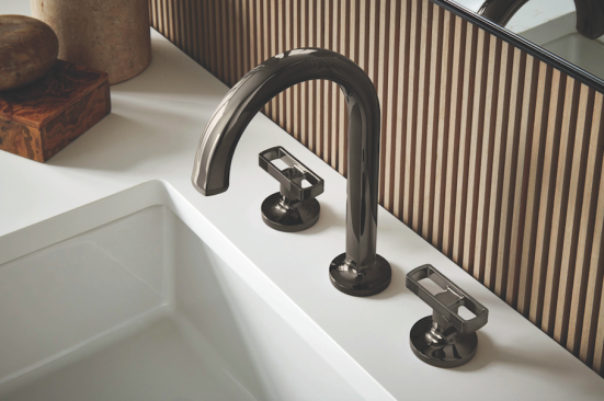 The Kintsu bath collection by Brizo, which debuted at 2020 IBS and will be available in the fall, combines the elegant minimalism of Scandinavian design with a motif of broken geometries to channel the Japanese philosophy of wabi-sabi. Faucets are offered with three handle options; the style shown here has an all-metal void design that can be left as is or in-filled with concrete, mother of pearl, or any number of custom inlays. Three finish options will be available: gold, polished chrome, and black onyx (shown), which is designed to balance both shadow and light. brizo.com
