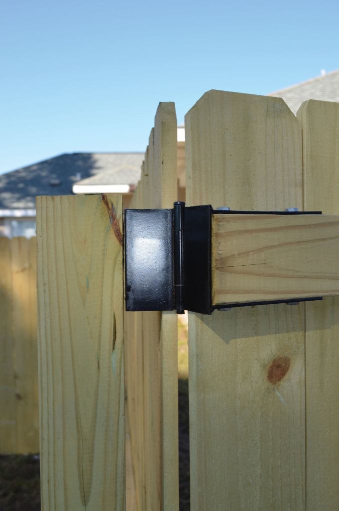 With a traditional strap-style hinge, the gate’s weight can loosen the wood grain around the screws, leading to sag. By contrast, the GForce Hinge has flanges that grab the top and bottom of the 2-by rail, and the gate’s weight compresses the wood grain, limiting sag. Fastening the hinge to the framing also means that the gate can be built in place, making it easy to achieve an exact fit. All Weather Fence, 850.916.0570, gforcehinge.com