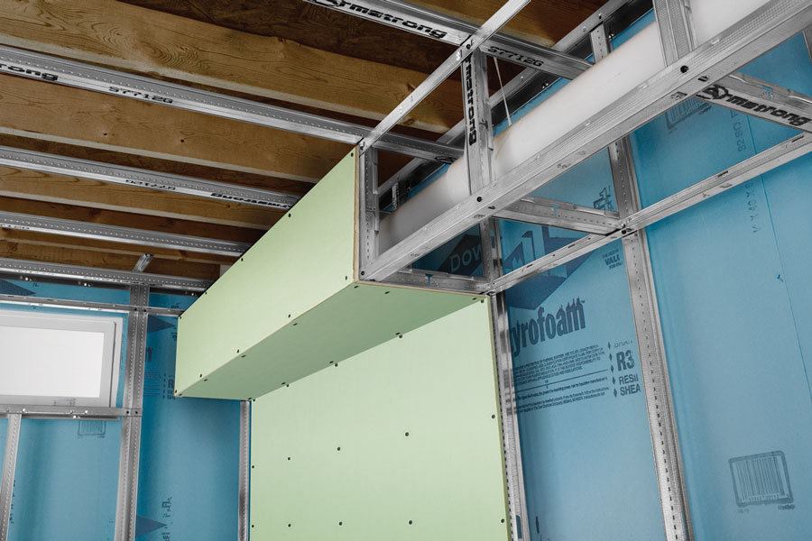 Armstrong’s QuikStix pre-engineered drywall grid system uses two types of studs: a 1 1/2-inch-deep T-shaped stud for basement perimeters or soffits around ductwork, and a nominal 2×4 H-stud for interior partitions. Tracks are notched every 8 inches, so the studs can simply be snapped into place. The manufacturer claims that the system cuts framing time in half. Armstrong, 877.276.7876, armstrong.com