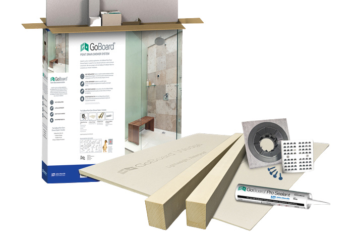 The Johns Manville GoBoard Shower Pan Kit offers on-site shower-pan customization, allowing for same-day tile installation. The kit works with new shower build-outs or tub-to-shower conversions and accommodates center and offset drain locations and curbed or curbless applications. The kit includes a GoBoard Point Drain Kit, four GoBoard Wedges (presloped backer boards), two GoBoard curbs, and three tubes of GoBoard pro sealant. jm.com