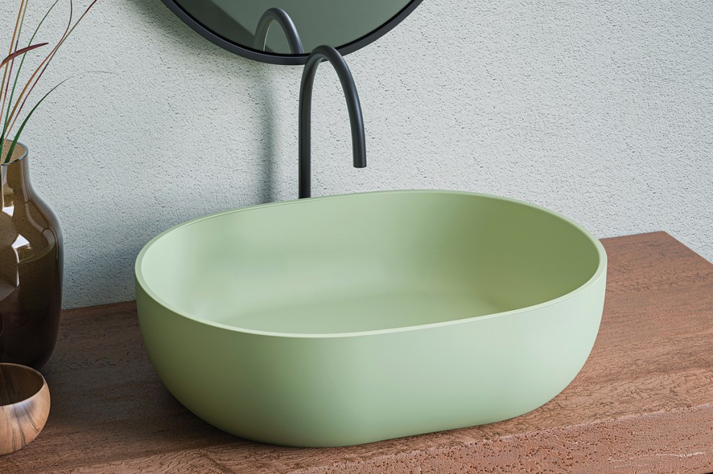 Crafted from 70% crushed natural stone and minerals blended with resins, Ruvati’s epiStone series of bathroom sinks are available in a 19-inch-by-14-inch curved-vessel base Canali model and a 23-inch-by-15-inch straight-sided Omnia model. Ruvati says the nonporous surface is easy to maintain, and the oval silhouette was designed with water drainage and cleaning in mind. The sinks come in five colors ranging from matte white to avocado lime green. ruvati.com