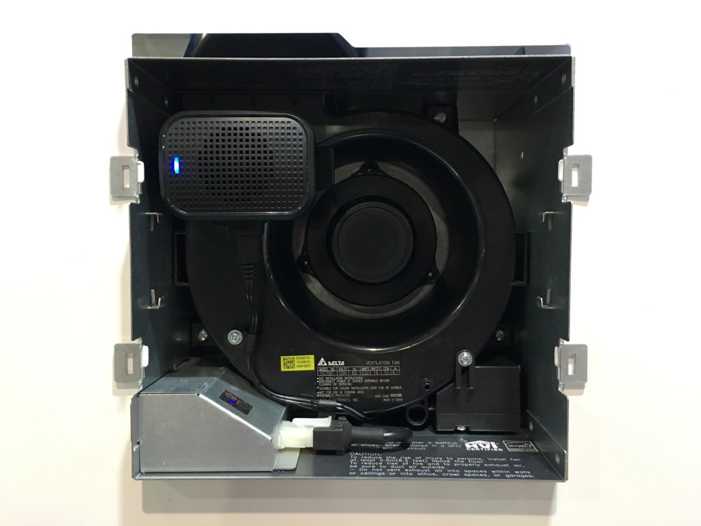A speaker built into the ventilation fan lets users enjoy entertainment while they get ready