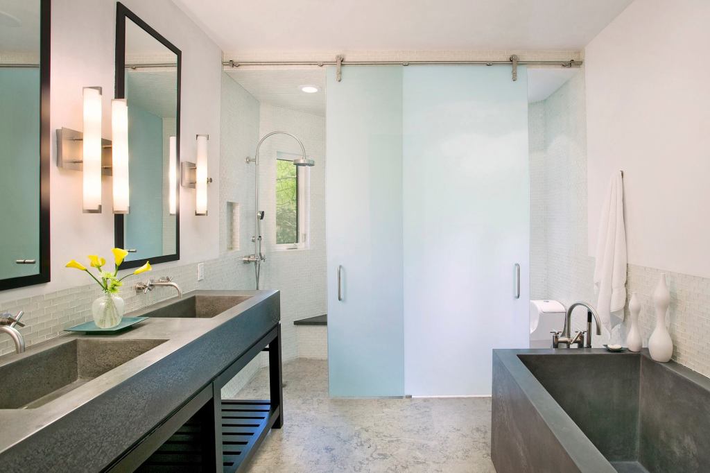 designer glass options for all types of projects. In the bathroom, SatinTech frameless shower doors offer an etched, ultra-brilliant finish that combines the popular frosted aesthetic with ease of maintenance. Bendheim says the chemically etched surface is naturally resistant to fingerprints and staining over the life of the product. The etched surface of the glass faces outward in this barn door-style installation from