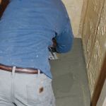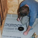 The weep drain was already in place. I checked that the floor was level, then nailed down a piece of 1/2-inch-thick Durock cement board in a bed of thinset.