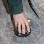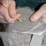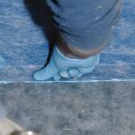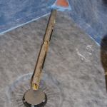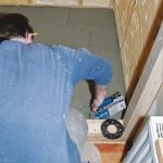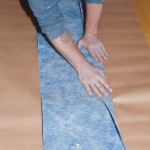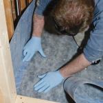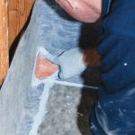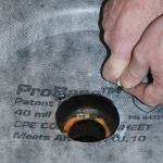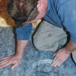The first thing I did was place the base on the ground and stomp on it. Reassured of its strength, I also tried to peel the membrane away from the plastic structure, but it held firm. Cutting the base to size was easy. The instructions recommend scoring and snapping the base, as you would do with drywall, but with a product this costly I wanted to make sure I had a clean cut. So I cut first from the top, using a utility knife (Slide 1), then flipped it over and finished cutting from the back (Slide 2).