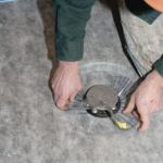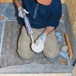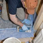 The weep drain was already in place. I checked that the floor was level, then nailed down a piece of 1/2-inch-thick Durock cement board in a bed of thinset (Slides 3, 4) over the floor sheathing to bring the surface flush with the drain flange. After fine-tuning the fit of the base Slide (5), I prepared to bond it to the floor, first troweling out modified thinset with a 1/4-inch-by-3/8-inch square-notch trowel (Slide 6), then applying a double ring of Noblesealant 150 (Slide 7) around the drain flange (Slide 8). I set the base into place (Slide 9) and firmly pressed the membrane into the sealant around the drain (Slide 10). Next I cut out the drain center and the bolt holes around the perimeter (Slide 11) so that I could install the top half of the drain while the sealant set up. Note that the bottom of the clamping ring is grooved to allow water to weep into the drain (Slide 12). There are eight holes; four of them are bolt holes, but the other four receive water from the grooves and pass it into the drain. It’s important for these grooves to remain unobstructed, so for now I bolted the clamp ring onto the drain upside-down, flat-side down, so that the sealant and membrane fabric wouldn’t squeeze up into the drainage grooves as the sealant set (Slide 13).