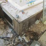 A good example of a catastrophic failure can be seen in this master bathroom, where one end of this tub deck is inside the shower enclosure. It looked to be in good shape, but we got called in when water started to leak through the ceiling below. When we opened up the shower, we could see that the rot was extensive. There were termites living in the floor framing beneath it.