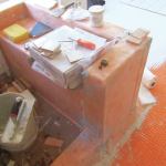 For extra protection at curbs, knee walls, and benches, we use Schluter Systems’ Kerdi liner, a soft polyethylene membrane that is applied over the top of the tile backer with a trowel-applied, thin-set mortar.
